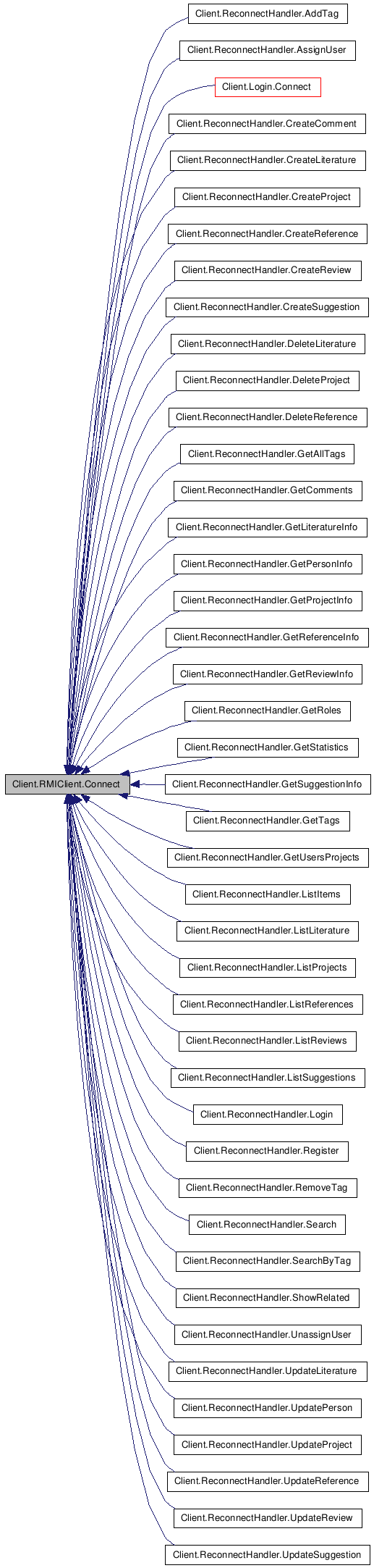 Referenced by Client.ReconnectHandler.AddTag(), Client.ReconnectHandler.AssignUser(), Client.Login.Connect(), Client.ReconnectHandler.CreateComment(), Client.ReconnectHandler.CreateLiterature(), Client.ReconnectHandler.CreateProject(), Client.ReconnectHandler.CreateReference(), Client.ReconnectHandler.CreateReview(), Client.ReconnectHandler.CreateSuggestion(), Client.ReconnectHandler.DeleteLiterature(), Client.ReconnectHandler.DeleteProject(), Client.ReconnectHandler.DeleteReference(), Client.ReconnectHandler.GetAllTags(), Client.ReconnectHandler.GetComments(), Client.ReconnectHandler.GetLiteratureInfo(), Client.ReconnectHandler.GetPersonInfo(), Client.ReconnectHandler.GetProjectInfo(), Client.ReconnectHandler.GetReferenceInfo(), Client.ReconnectHandler.GetReviewInfo(), Client.ReconnectHandler.GetRoles(), Client.ReconnectHandler.GetStatistics(), Client.ReconnectHandler.GetSuggestionInfo(), Client.ReconnectHandler.GetTags(), Client.ReconnectHandler.GetUsersProjects(), Client.ReconnectHandler.ListItems(), Client.ReconnectHandler.ListLiterature(), Client.ReconnectHandler.ListProjects(), Client.ReconnectHandler.ListReferences(), Client.ReconnectHandler.ListReviews(), Client.ReconnectHandler.ListSuggestions(), Client.ReconnectHandler.Login(), Client.ReconnectHandler.Register(), Client.ReconnectHandler.RemoveTag(), Client.ReconnectHandler.Search(), Client.ReconnectHandler.SearchByTag(), Client.ReconnectHandler.ShowRelated(), Client.ReconnectHandler.UnassignUser(), Client.ReconnectHandler.UpdateLiterature(), Client.ReconnectHandler.UpdatePerson(), Client.ReconnectHandler.UpdateProject(), Client.ReconnectHandler.UpdateReference(), Client.ReconnectHandler.UpdateReview(), and Client.ReconnectHandler.UpdateSuggestion().